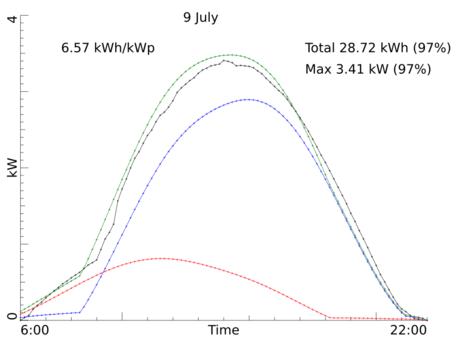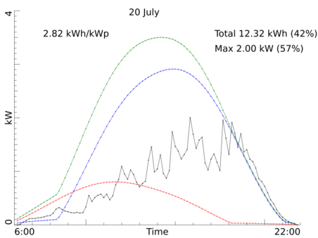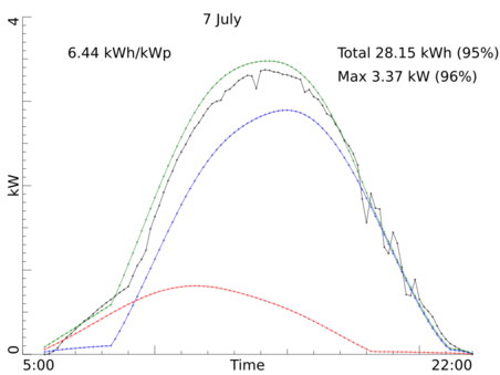 Day by day production, July 2013Our PV installation registers the average power over every 10 minute interval during the day. Here are the per-day production graphs for the month July 2013. Every graph shows (in black) the observed power averaged over 10 minute intervals. In text you find the maximum observed power, the total production in kWh for the entire day, and the production per kW-peak of the system. Both the total production and the maximum power also are given as percentage of a model calculation for our system if the day would have been fully sunny. The model calculation is drawn in three colored curves: red for the side-roof (east-south-east), blue for the front roof of the house (south-south-west), and green for the sum of those two. Click on any graph to see a bigger version. Back to the overall statistics ![]() ![]() ![]() ![]() ![]() ![]() ![]() ![]() ![]() ![]() ![]() ![]() ![]() ![]() ![]() ![]() ![]() ![]() ![]() ![]() ![]() ![]() ![]() ![]() ![]() ![]() ![]() ![]() ![]() ![]() ![]() Total production this month: 664.18 kWh |