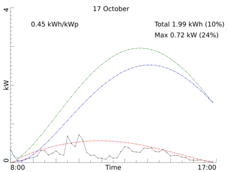 Day by day production, October 2015Our PV installation registers the average power over every 10 minute interval during the day. Here are the per-day production graphs for the month October 2015. Every graph shows (in black) the observed power averaged over 10 minute intervals. In text you find the maximum observed power, the total production in kWh for the entire day, and the production per kW-peak of the system. Both the total production and the maximum power also are given as percentage of a model calculation for our system if the day would have been fully sunny. The model calculation is drawn in three colored curves: red for the side-roof (east-south-east), blue for the front roof of the house (south-south-west), and green for the sum of those two. Click on any graph to see a bigger version. Back to the overall statistics ![]() ![]() ![]() ![]() ![]() ![]() ![]() ![]() ![]() ![]() ![]() ![]() ![]() ![]() ![]() ![]() ![]() ![]() ![]() ![]() ![]() ![]() ![]() ![]() ![]() ![]() ![]() ![]() ![]() ![]() ![]() Total production this month: 291.18 kWh |