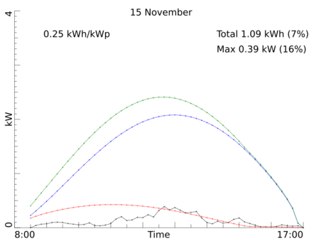 Day by day production, November 2015Our PV installation registers the average power over every 10 minute interval during the day. Here are the per-day production graphs for the month November 2015. Every graph shows (in black) the observed power averaged over 10 minute intervals. In text you find the maximum observed power, the total production in kWh for the entire day, and the production per kW-peak of the system. Both the total production and the maximum power also are given as percentage of a model calculation for our system if the day would have been fully sunny. The model calculation is drawn in three colored curves: red for the side-roof (east-south-east), blue for the front roof of the house (south-south-west), and green for the sum of those two. Click on any graph to see a bigger version. Back to the overall statistics ![]() ![]() ![]() ![]() ![]() ![]() ![]() ![]() ![]() ![]() ![]() ![]() ![]() ![]() ![]() ![]() ![]() ![]() ![]() ![]() ![]() ![]() ![]() ![]() ![]() ![]() ![]() ![]() ![]() ![]() Total production this month: 123.45 kWh |