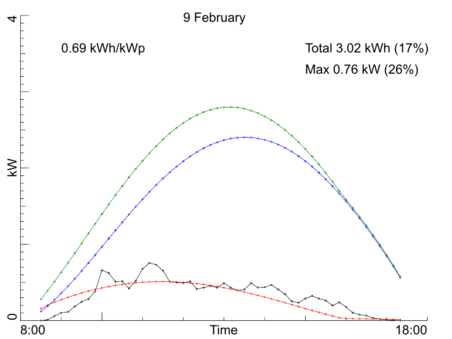 Day by day production, February 2018Our PV installation registers the average power over every 10 minute interval during the day. Here are the per-day production graphs for the month February 2018. Every graph shows (in black) the observed power averaged over 10 minute intervals. In text you find the maximum observed power, the total production in kWh for the entire day, and the production per kW-peak of the system. Both the total production and the maximum power also are given as percentage of a model calculation for our system if the day would have been fully sunny. The model calculation is drawn in three colored curves: red for the side-roof (east-south-east), blue for the front roof of the house (south-south-west), and green for the sum of those two. Click on any graph to see a bigger version. Back to the overall statistics