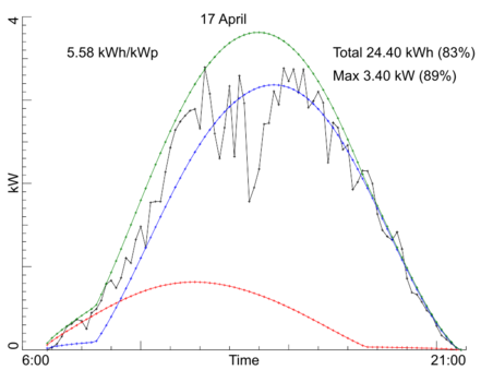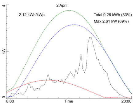 Day by day production, April 2018Our PV installation registers the average power over every 10 minute interval during the day. Here are the per-day production graphs for the month April 2018. Every graph shows (in black) the observed power averaged over 10 minute intervals. In text you find the maximum observed power, the total production in kWh for the entire day, and the production per kW-peak of the system. Both the total production and the maximum power also are given as percentage of a model calculation for our system if the day would have been fully sunny. The model calculation is drawn in three colored curves: red for the side-roof (east-south-east), blue for the front roof of the house (south-south-west), and green for the sum of those two. Click on any graph to see a bigger version. Back to the overall statistics ![]() ![]() ![]() ![]() ![]() ![]() ![]() ![]() ![]() ![]() ![]() ![]() ![]() ![]() ![]() ![]() ![]() ![]() ![]() ![]() ![]() ![]() ![]() ![]() ![]() ![]() ![]() ![]() ![]() ![]() Total production this month: 513.79 kWh |
