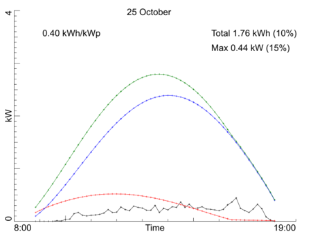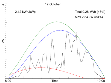 Day by day production, October 2021Our PV installation registers the average power over every 10 minute interval during the day. Here are the per-day production graphs for the month October 2021. Every graph shows (in black) the observed power averaged over 10 minute intervals. In text you find the maximum observed power, the total production in kWh for the entire day, and the production per kW-peak of the system. Both the total production and the maximum power also are given as percentage of a model calculation for our system if the day would have been fully sunny. The model calculation is drawn in three colored curves: red for the side-roof (east-south-east), blue for the front roof of the house (south-south-west), and green for the sum of those two. Click on any graph to see a bigger version. Back to the overall statistics ![]() ![]() ![]() ![]() ![]() ![]() ![]() ![]() ![]() ![]() ![]() ![]() ![]() ![]() ![]() ![]() ![]() ![]() ![]() ![]() ![]() ![]() ![]() ![]() ![]() ![]() ![]() ![]() ![]() ![]() ![]() Total production this month: 257.22 kWh |