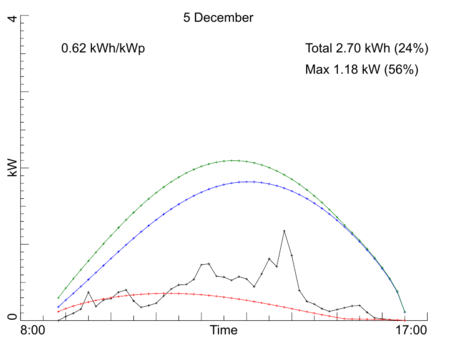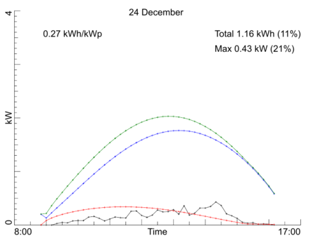 Day by day production, December 2021Our PV installation registers the average power over every 10 minute interval during the day. Here are the per-day production graphs for the month December 2021. Every graph shows (in black) the observed power averaged over 10 minute intervals. In text you find the maximum observed power, the total production in kWh for the entire day, and the production per kW-peak of the system. Both the total production and the maximum power also are given as percentage of a model calculation for our system if the day would have been fully sunny. The model calculation is drawn in three colored curves: red for the side-roof (east-south-east), blue for the front roof of the house (south-south-west), and green for the sum of those two. Click on any graph to see a bigger version. Back to the overall statistics ![]() ![]() ![]() ![]() ![]() ![]() ![]() ![]() ![]() ![]() ![]() ![]() ![]() ![]() ![]() ![]() ![]() ![]() ![]() ![]() ![]() ![]() ![]() ![]() ![]() ![]() ![]() ![]() ![]() ![]() ![]() Total production this month: 83.17 kWh |