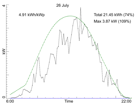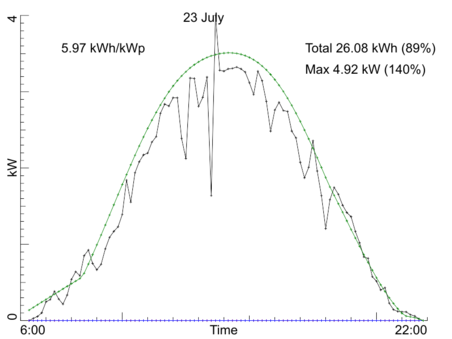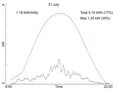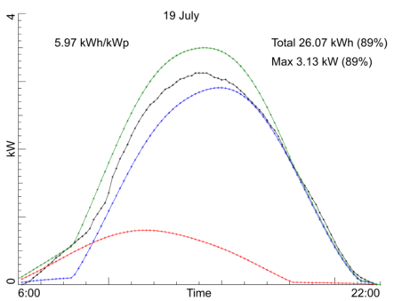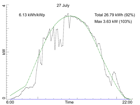 Day by day production, July 2022Our PV installation registers the average power over every 10 minute interval during the day. Here are the per-day production graphs for the month July 2022. Every graph shows (in black) the observed power averaged over 10 minute intervals. In text you find the maximum observed power, the total production in kWh for the entire day, and the production per kW-peak of the system. Both the total production and the maximum power also are given as percentage of a model calculation for our system if the day would have been fully sunny. The model calculation is drawn in three colored curves: red for the side-roof (east-south-east), blue for the front roof of the house (south-south-west), and green for the sum of those two. Click on any graph to see a bigger version. Back to the overall statistics ![]() ![]() ![]() ![]() ![]() ![]() ![]() ![]() ![]() ![]() ![]() ![]() ![]() ![]() ![]() ![]() ![]() ![]() ![]() ![]() ![]() ![]() ![]() ![]() ![]() ![]() ![]() ![]() ![]() ![]() ![]() Total production this month: 700.42 kWh |