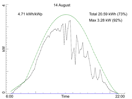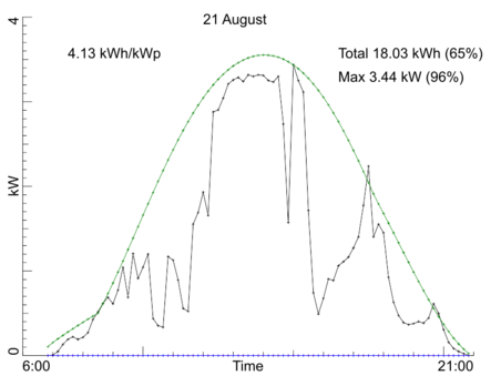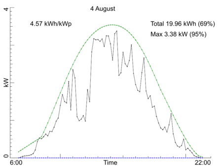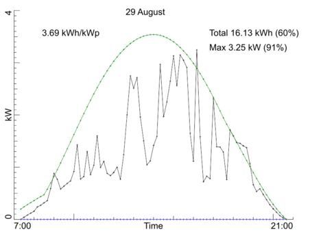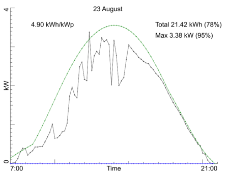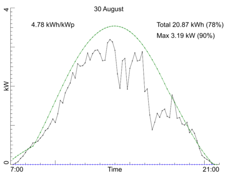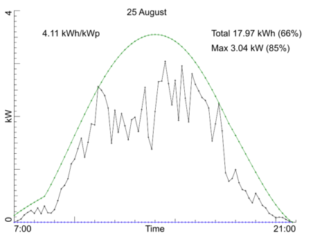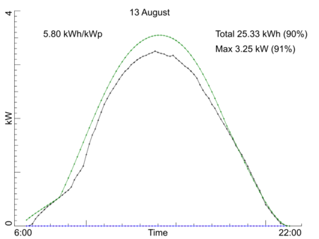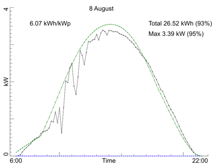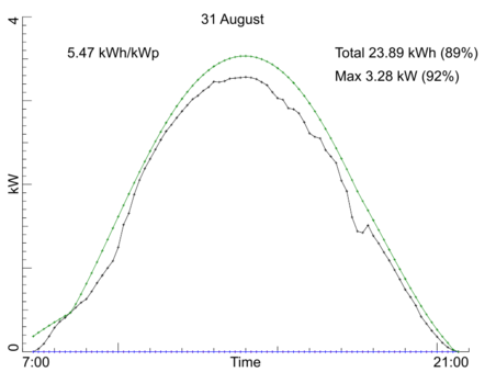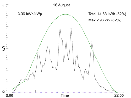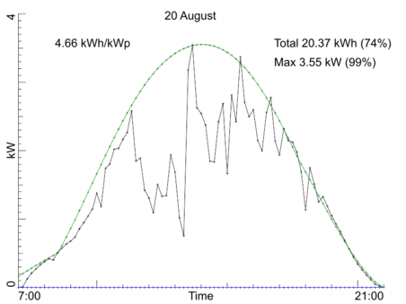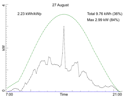 Day by day production, August 2022Our PV installation registers the average power over every 10 minute interval during the day. Here are the per-day production graphs for the month August 2022. Every graph shows (in black) the observed power averaged over 10 minute intervals. In text you find the maximum observed power, the total production in kWh for the entire day, and the production per kW-peak of the system. Both the total production and the maximum power also are given as percentage of a model calculation for our system if the day would have been fully sunny. The model calculation is drawn in three colored curves: red for the side-roof (east-south-east), blue for the front roof of the house (south-south-west), and green for the sum of those two. Click on any graph to see a bigger version. Back to the overall statistics ![]() ![]() ![]() ![]() ![]() ![]() ![]() ![]() ![]() ![]() ![]() ![]() ![]() ![]() ![]() ![]() ![]() ![]() ![]() ![]() ![]() ![]() ![]() ![]() ![]() ![]() ![]() ![]() ![]() ![]() ![]() Total production this month: 637.53 kWh |